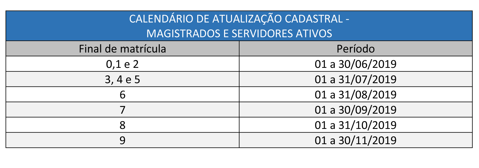 Confira, abaixo, o cronograma de recadastramento dos magistrados e servidores ativos: