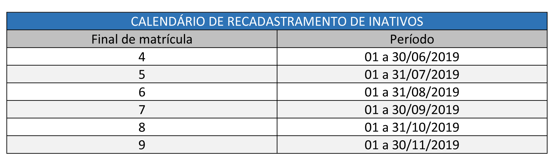 O recadastramento será realizado até novembro, mas todos devem ficar atentos ao cronograma estipulado de acordo com o número final de sua matrícula. Aqueles com matricula final 0, 1 ou 2, deverão se recadastrar até o dia 28 de junho. Já para quem tem matrícula com final 9, por exemplo, o recadastramento será no mês de novembro.