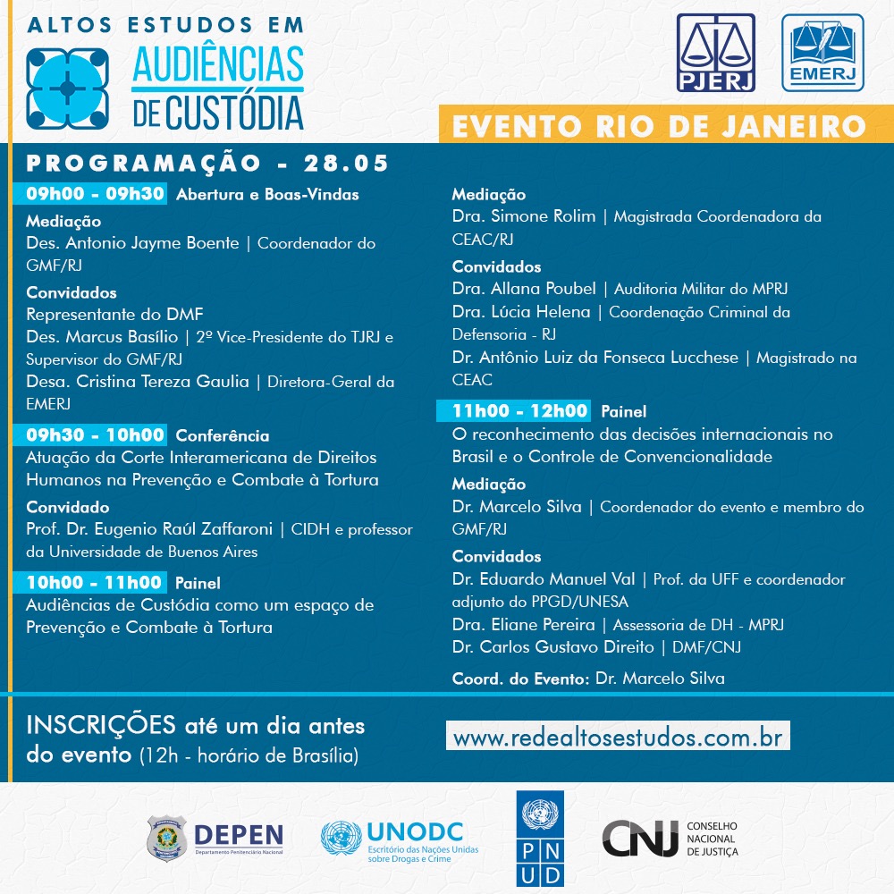 O Tribunal de Justiça do Estado do Rio de Janeiro (TJRJ) promove o evento virtual ‘Altos Estudos em Audiências de Custódia’ em parceria com o Programa Fazendo Justiça, do Conselho Nacional de Justiça (CNJ), na próxima sexta-feira (28/5), das 9h às 12h. As inscrições podem ser feitas pelo endereço eletrônico: https://zoom.us/webinar/register/WN_vh_HTp8gSJ6wH_TDWdEdeg